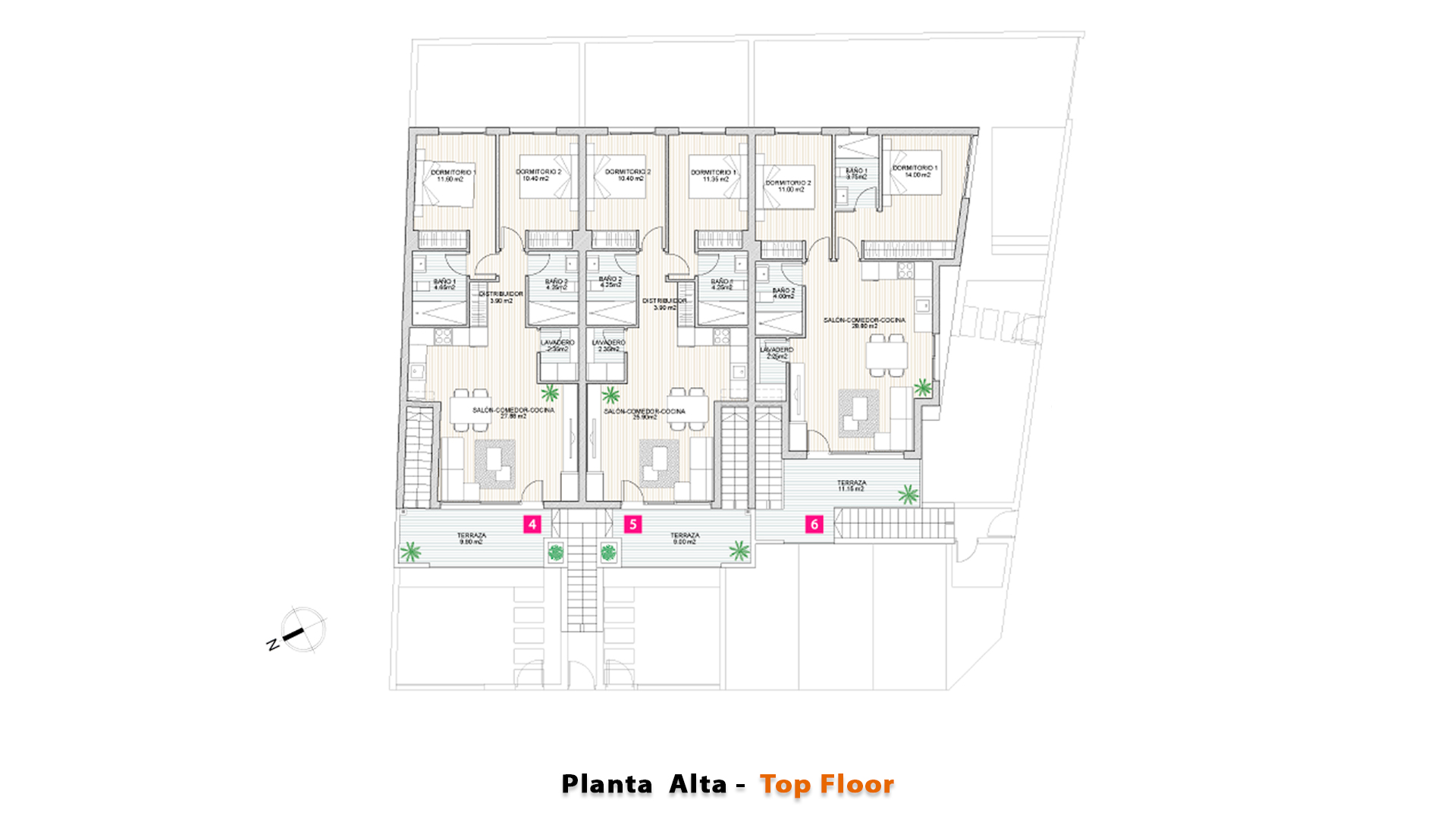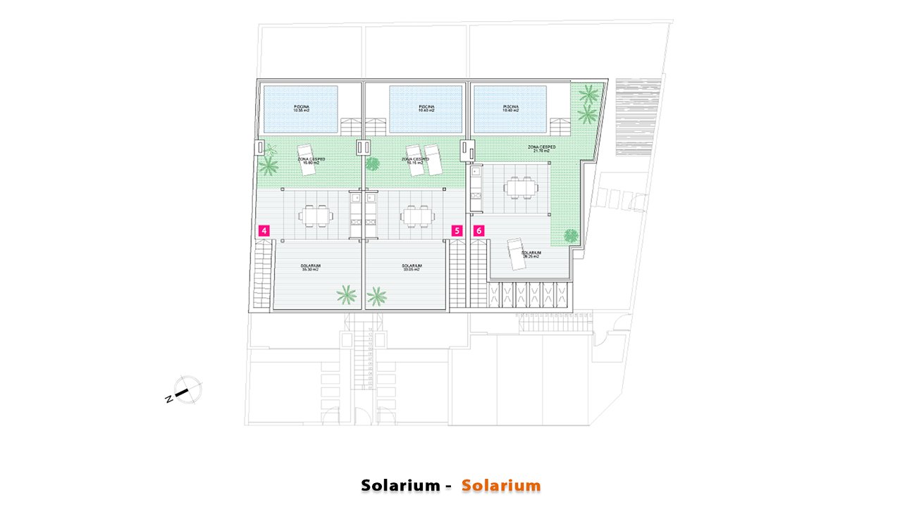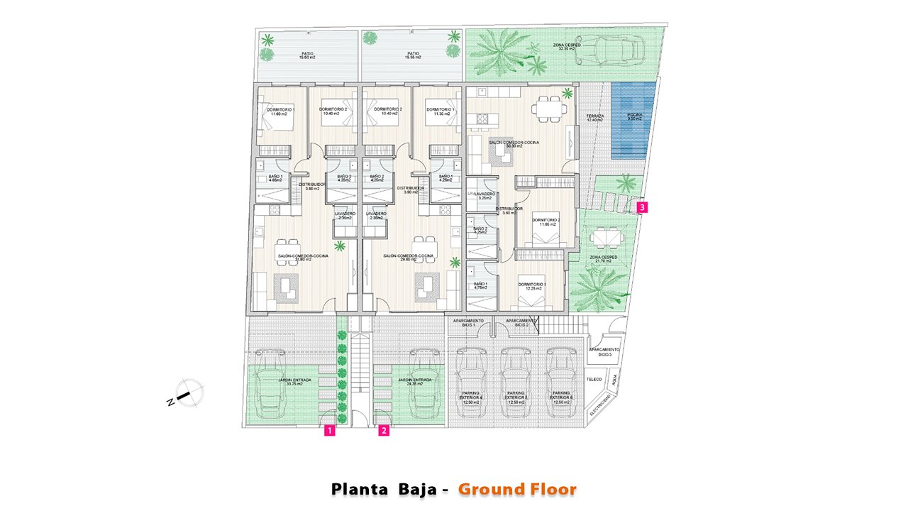 | № BUNG | Dormitorios | Baños | m² interior | m² solarium | m² exterior | Parking | Piscina | Cocina eq. | PRECIO | ||